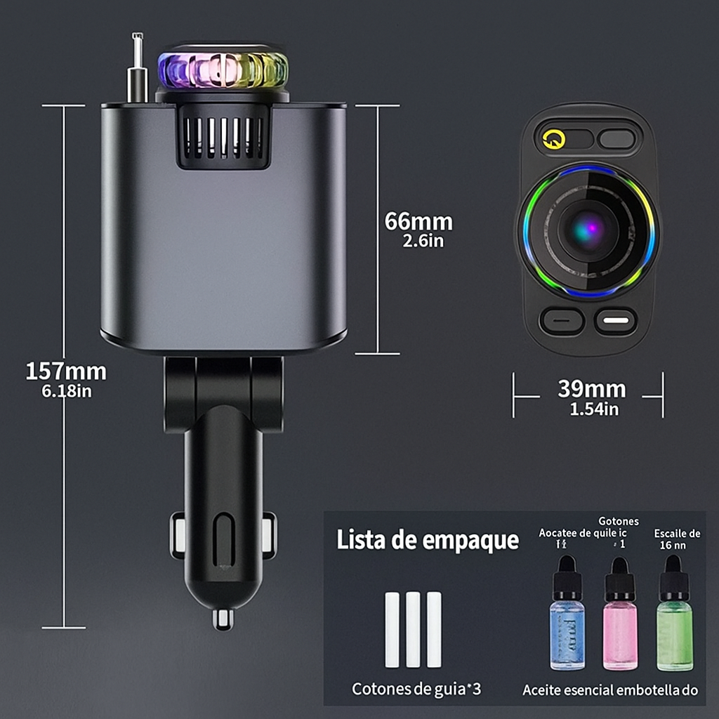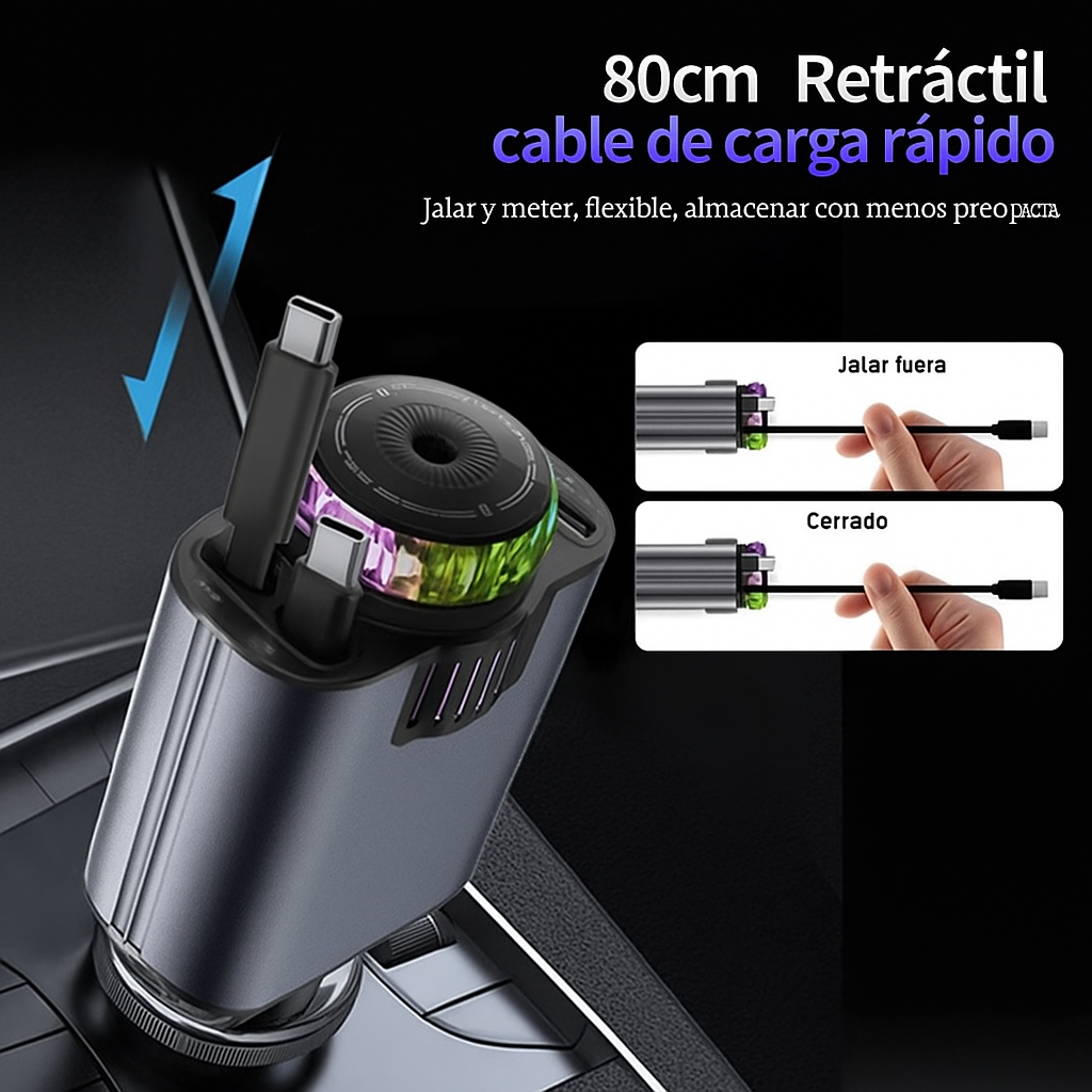 Ofrece carga rápida de hasta 120W, un sistema retráctil que evita enredos y un difusor de aroma para mantener tu carro siempre fresco.